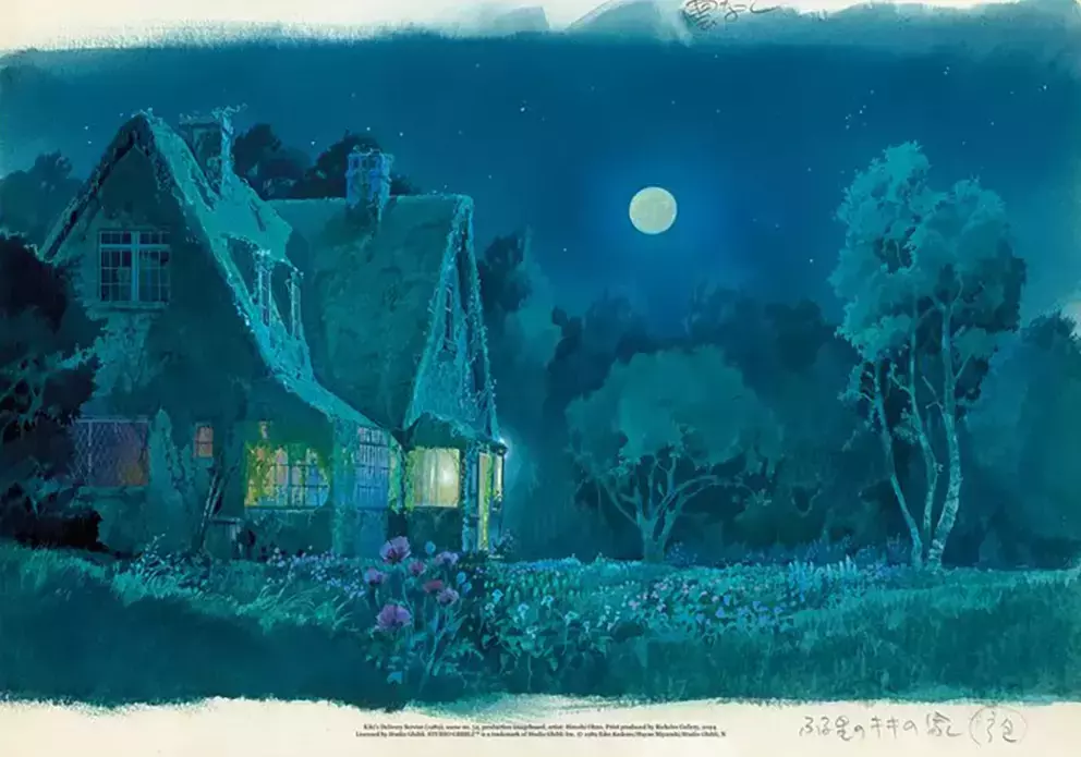 These beautiful images are high-quality posters made by Riekeles Gallery of Hiroshi Ohno’s production imageboards for Hayao Miyazaki’s animated feature Kiki’s Delivery Service (1989).