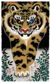 "There is a Japanese proverb that says: 'Cats don't know what's inside the tiger's mind.' It implies that ordinary people cannot understand the thoughts and feelings of great men. I thought it would be interesting to reverse this and replaced the tiger with the cat and vise versa. If you look closely you can see various characters and sounds related to cats as well as cat shapes are hidden among the leaves. The writing at the bottom of the composition are in a typeface that looks like archaic Japanese characters. I wanted to deconstruct and reassembled them so that even a Japanese person cannot decipher it."